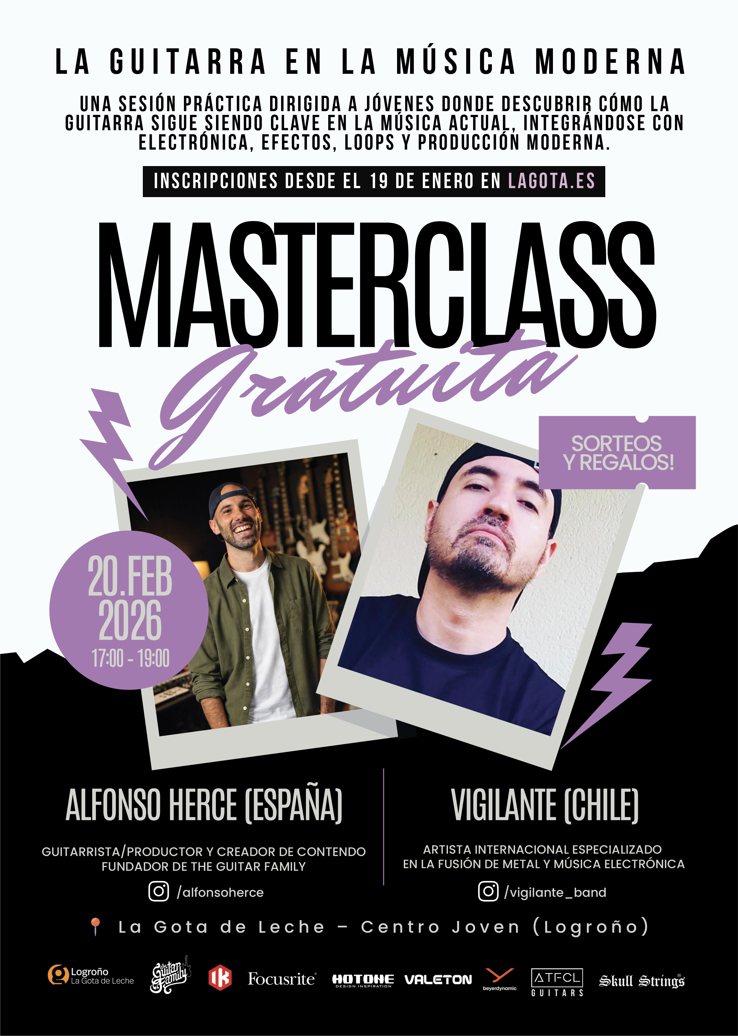 Masterclass gratuita dirigida a jóvenes centrada en la guitarra dentro de la música moderna: pop, música urbana y electrónica.Durante la sesión se mostrará cómo la guitarra sigue siendo un instrumento clave en la creación musical actual, integrándose con tecnología, efectos y producción contemporánea.