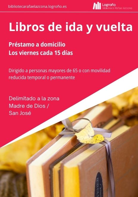 Este curso seguimos con servicio ‘Libros de ida y vuelta’ que ofrece el préstamo de libros a personas mayores de 65 años, y a personas con movilidad reducida temporal o permanente (enfermedades crónicas, periodos de convalecencia, discapacidades físicas…)Este servicio se realiza todos los viernes de 10:00 a 12:00 horas y en las viviendas del entorno de la Biblioteca Rafael Azcona, tanto para la entrega de los libros en préstamo como para su recogida y devolución se encargan personas voluntarias de ASPRODEMA.¿Cómo funciona?Si vives en la zona delimitada del mapa (San José / Madre de Dios) y quieres leer en casa:Llámanos al 941 245 811Dinos qué libro quieresTe lo llevamos el próximo viernes